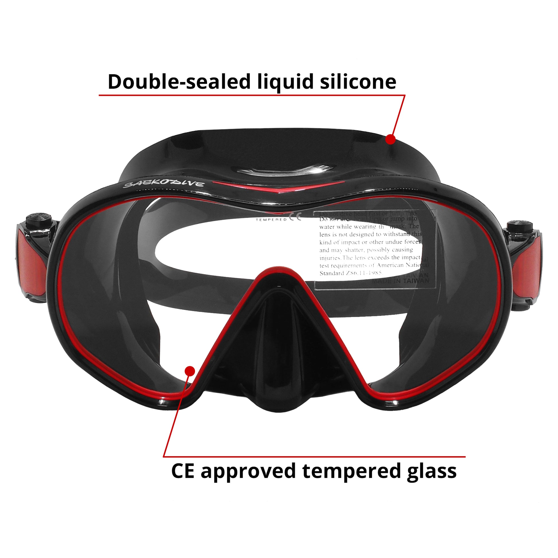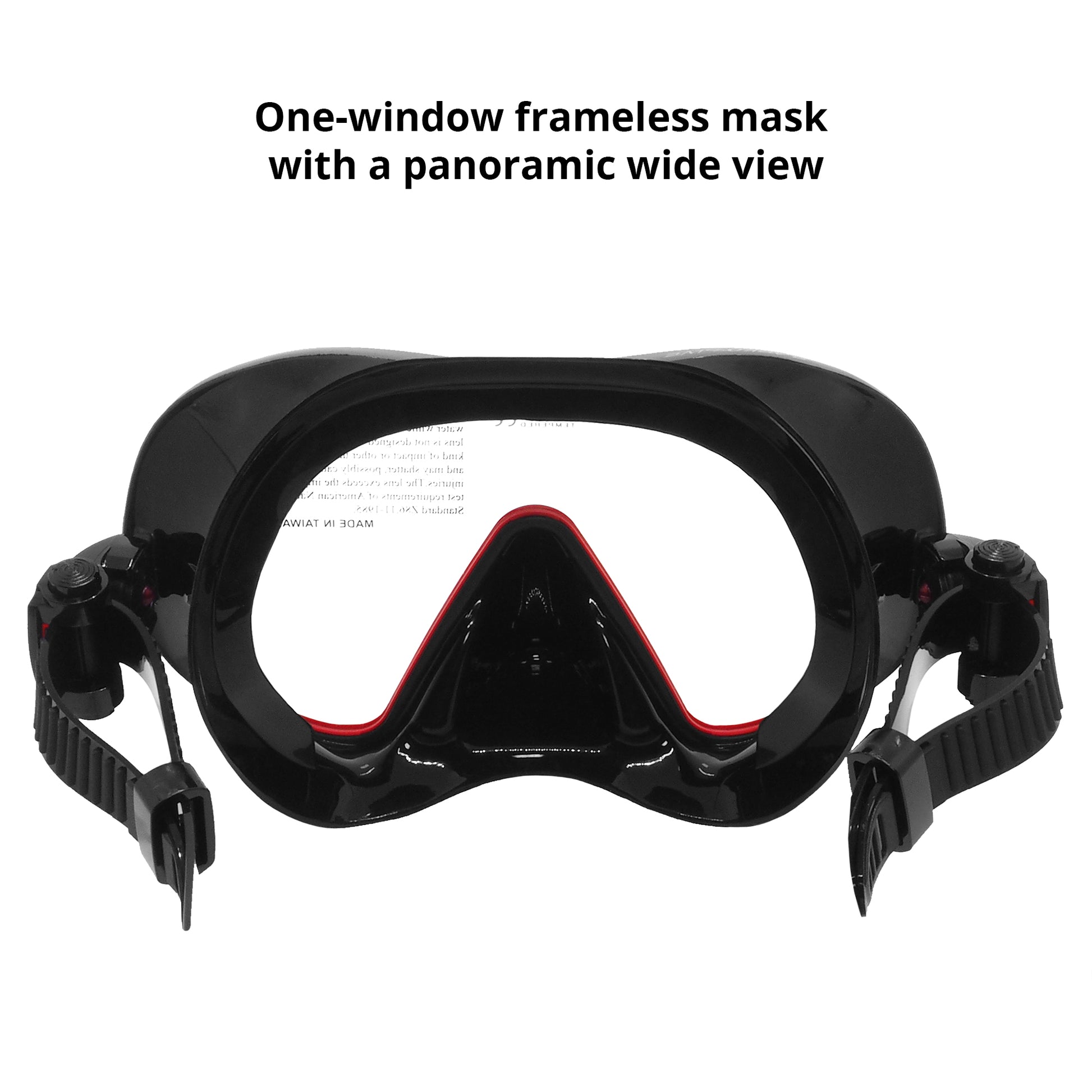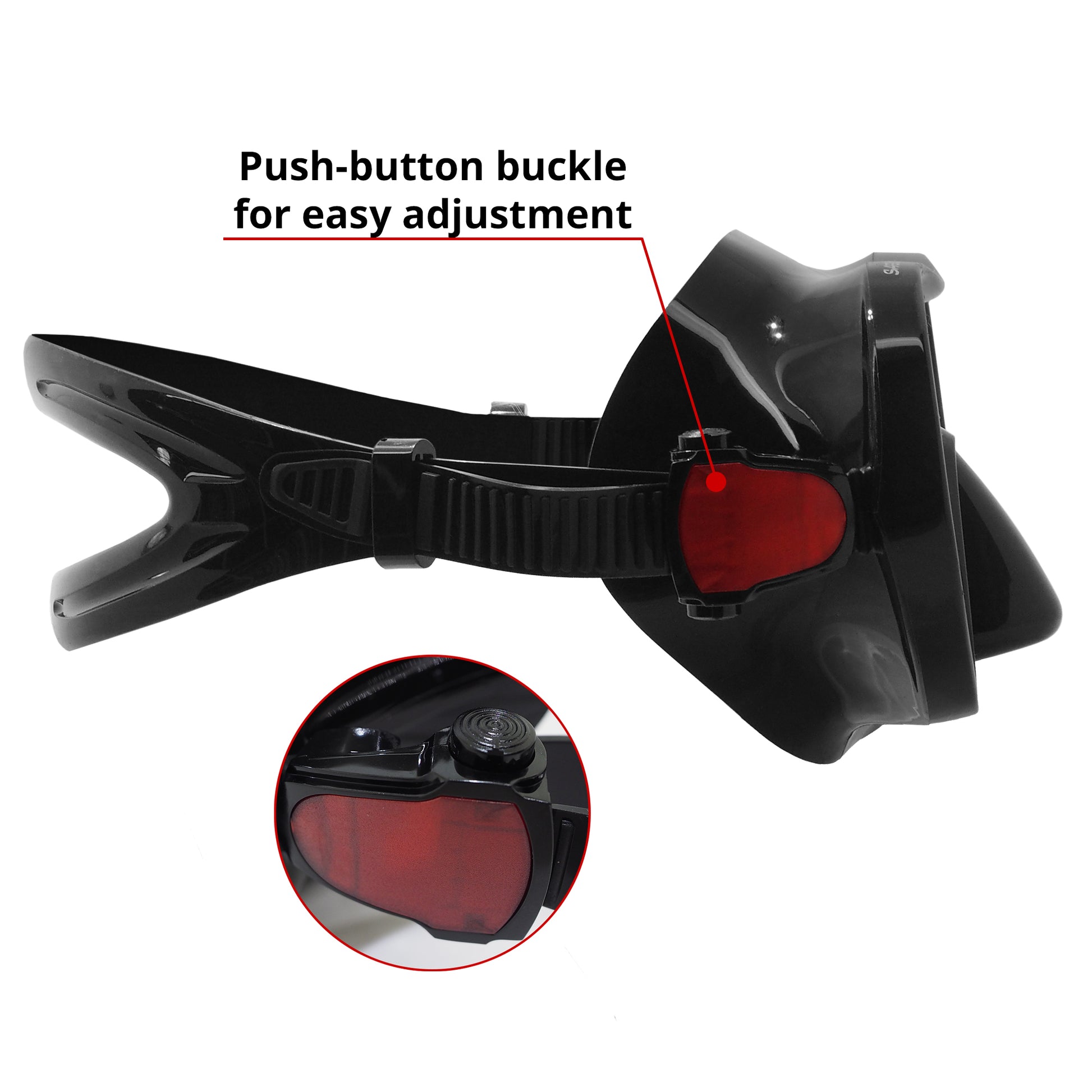 Indulge in an expansive underwater experience with our Wide View & Foldable diving mask. This one-window frameless design offers a panoramic field of view, and the added convenience of folding it flat ensures easy carrying wherever your aquatic adventures take you. The CE approved tempered glass, embodying anti-fog properties, is meticulously designed with reliability, safety, and environmental consciousness in mind. The mask's double-sealed professional-grade liquid silicone skirt, soft and comfortable, guarantees a flexible fit that molds to various face shapes, creating a secure and anti-leak seal. The adjustable design features push-button buckles, allowing you to effortlessly customize the strap for maximum comfort and to prevent leakage.